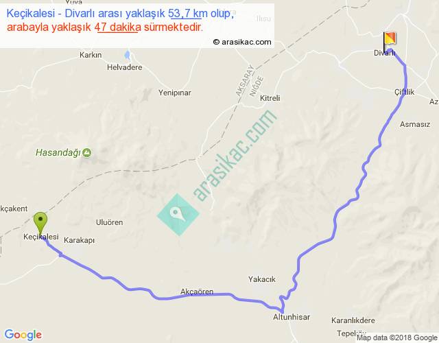 Keçikalesi - Divarlı arası yaklaşık olarak 90 km/h ile yukarıda belirtilen sürede olup, iki yerin kuş uçuşu uzaklığı (mesafesi) 34'dir. Yolculuk otobüsle 1 saat 1 dakika sürmektedir.