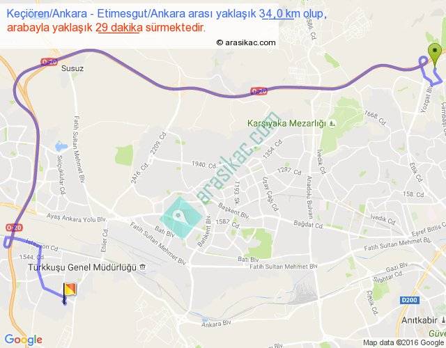 Keçiören Ankara - Etimesgut Ankara arası yaklaşık olarak 90 km/h ile yukarıda belirtilen sürede olup, iki yerin kuş uçuşu uzaklığı (mesafesi) 18'dir. Yolculuk otobüsle 37 dakika sürmektedir.