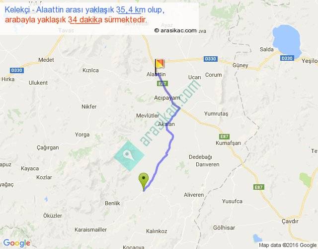 Kelekçi - Alaattin arası yaklaşık olarak 90 km/h ile yukarıda belirtilen sürede olup, iki yerin kuş uçuşu uzaklığı (mesafesi) 28'dir. Yolculuk otobüsle 44 dakika sürmektedir.