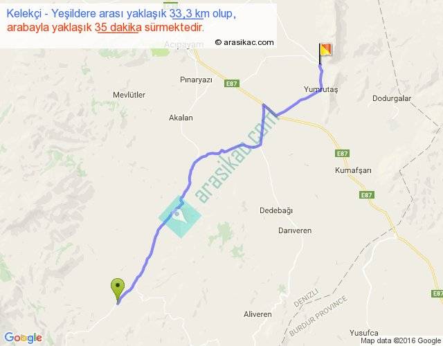 Kelekçi - Yeşildere arası yaklaşık olarak 90 km/h ile yukarıda belirtilen sürede olup, iki yerin kuş uçuşu uzaklığı (mesafesi) 27'dir. Yolculuk otobüsle 45 dakika sürmektedir.