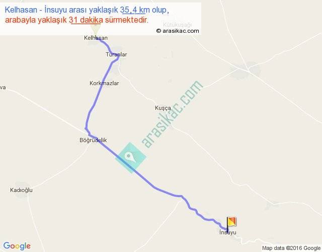 Kelhasan - İnsuyu arası yaklaşık olarak 90 km/h ile yukarıda belirtilen sürede olup, iki yerin kuş uçuşu uzaklığı (mesafesi) 28'dir. Yolculuk otobüsle 40 dakika sürmektedir.