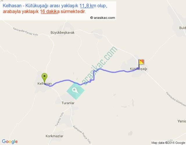 Kelhasan - Kütükuşağı arası yaklaşık olarak 90 km/h ile yukarıda belirtilen sürede olup, iki yerin kuş uçuşu uzaklığı (mesafesi) 10'dir. Yolculuk otobüsle 20 dakika sürmektedir.