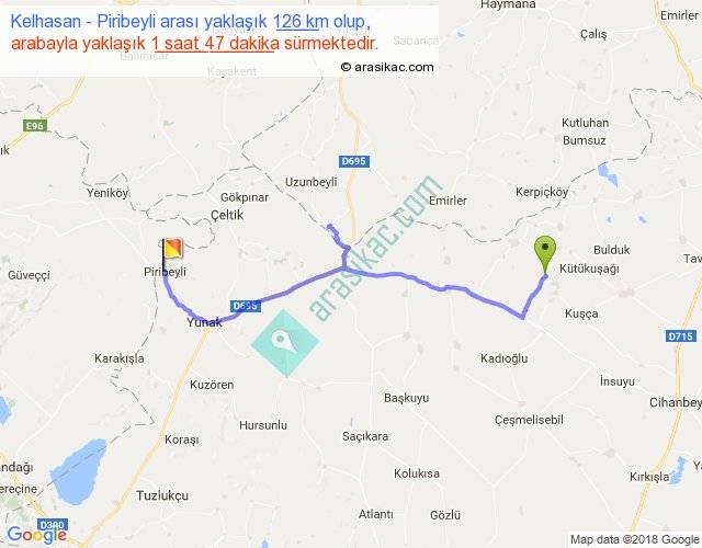 Kelhasan - Piribeyli arası yaklaşık olarak 90 km/h ile yukarıda belirtilen sürede olup, iki yerin kuş uçuşu uzaklığı (mesafesi) 82'dir. Yolculuk otobüsle 2 saat 19 dakika sürmektedir.