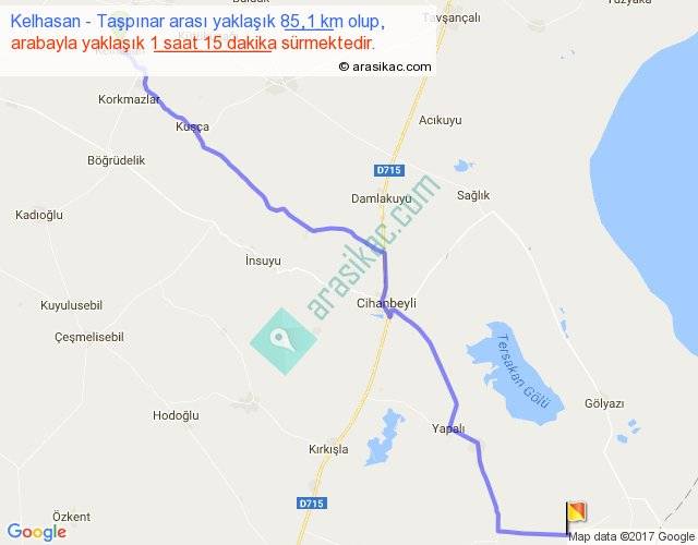 Kelhasan - Taşpınar arası yaklaşık olarak 90 km/h ile yukarıda belirtilen sürede olup, iki yerin kuş uçuşu uzaklığı (mesafesi) 72'dir. Yolculuk otobüsle 1 saat 37 dakika sürmektedir.