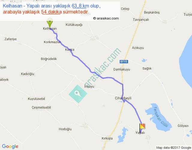 Kelhasan - Yapalı arası yaklaşık olarak 90 km/h ile yukarıda belirtilen sürede olup, iki yerin kuş uçuşu uzaklığı (mesafesi) 54'dir. Yolculuk otobüsle 1 saat 10 dakika sürmektedir.
