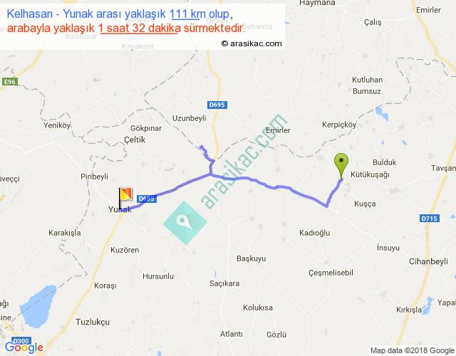Kelhasan - Yunak arası yaklaşık olarak 90 km/h ile yukarıda belirtilen sürede olup, iki yerin kuş uçuşu uzaklığı (mesafesi) 74'dir. Yolculuk otobüsle 1 saat 59 dakika sürmektedir.