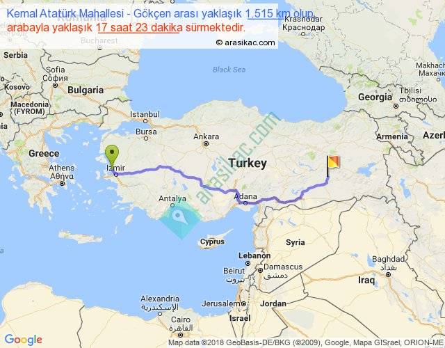 Kemal Atatürk Mahallesi - Gökçen arası yaklaşık olarak 90 km/h ile yukarıda belirtilen sürede olup, iki yerin kuş uçuşu uzaklığı (mesafesi) 1180'dir. Eğer belirtilen yerler arasında uçak seferi var ise bu süre uçakla 1 saat 48 dakika'ya kadar düşebilir. Yolculuk otobüsle 22 saat 35 dakika sürmektedir.