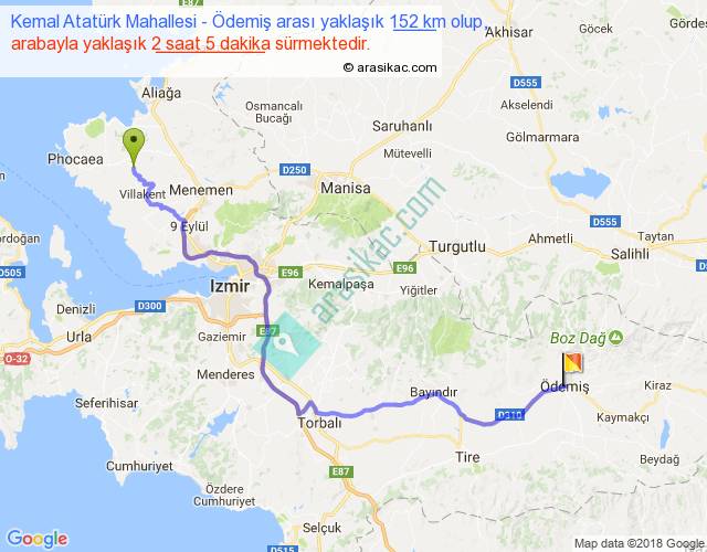 Kemal Atatürk Mahallesi - Ödemiş arası yaklaşık olarak 90 km/h ile yukarıda belirtilen sürede olup, iki yerin kuş uçuşu uzaklığı (mesafesi) 104'dir. Yolculuk otobüsle 2 saat 42 dakika sürmektedir.