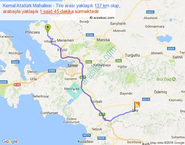 Kemal Atatürk Mahallesi - Tire arası yaklaşık olarak 90 km/h ile yukarıda belirtilen sürede olup, iki yerin kuş uçuşu uzaklığı (mesafesi) 95'dir. Yolculuk otobüsle 2 saat 16 dakika sürmektedir.
