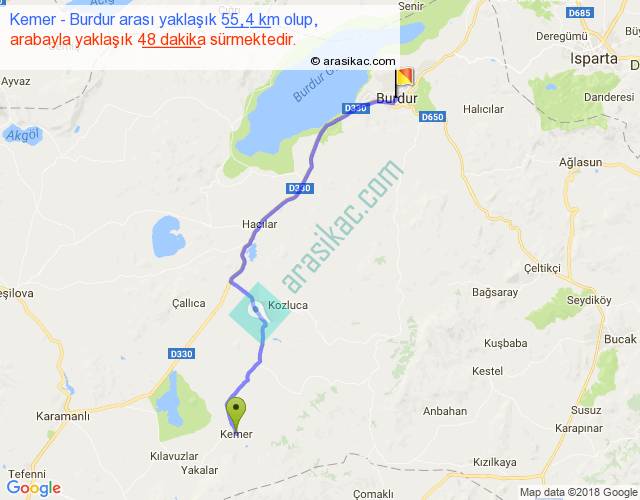 Kemer - Burdur arası yaklaşık olarak 90 km/h ile yukarıda belirtilen sürede olup, iki yerin kuş uçuşu uzaklığı (mesafesi) 126'dir. Yolculuk otobüsle 2 saat 52 dakika sürmektedir.