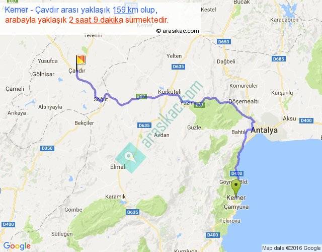 Kemer - Çavdır arası yaklaşık olarak 90 km/h ile yukarıda belirtilen sürede olup, iki yerin kuş uçuşu uzaklığı (mesafesi) 98'dir. Yolculuk otobüsle 2 saat 47 dakika sürmektedir.