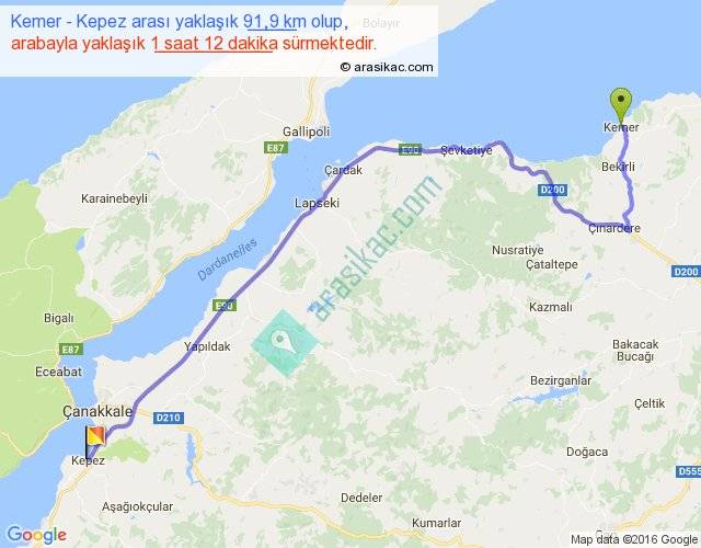 Kemer - Kepez arası yaklaşık olarak 90 km/h ile yukarıda belirtilen sürede olup, iki yerin kuş uçuşu uzaklığı (mesafesi) 529'dir. Eğer belirtilen yerler arasında uçak seferi var ise bu süre uçakla 48 dakika'ya kadar düşebilir. Yolculuk otobüsle 12 saat 9 dakika sürmektedir.