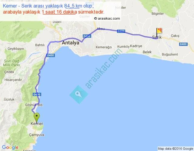 Kemer - Serik arası yaklaşık olarak 90 km/h ile yukarıda belirtilen sürede olup, iki yerin kuş uçuşu uzaklığı (mesafesi) 59'dir. Yolculuk otobüsle 1 saat 38 dakika sürmektedir.