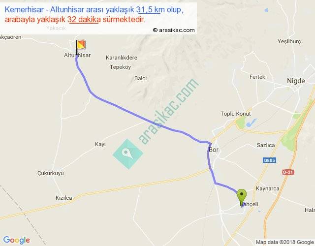 Kemerhisar - Altunhisar arası yaklaşık olarak 90 km/h ile yukarıda belirtilen sürede olup, iki yerin kuş uçuşu uzaklığı (mesafesi) 27'dir. Yolculuk otobüsle 41 dakika sürmektedir.