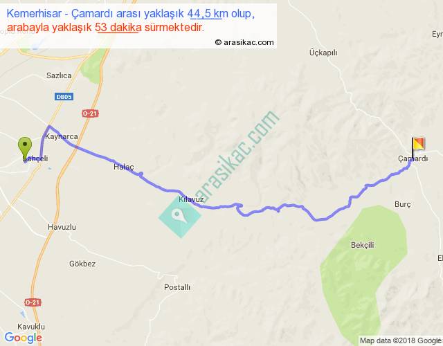 Kemerhisar - Çamardı arası yaklaşık olarak 90 km/h ile yukarıda belirtilen sürede olup, iki yerin kuş uçuşu uzaklığı (mesafesi) 34'dir. Yolculuk otobüsle 1 saat 8 dakika sürmektedir.