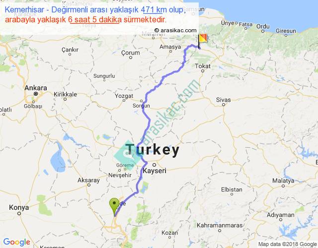 Kemerhisar - Değirmenli arası yaklaşık olarak 90 km/h ile yukarıda belirtilen sürede olup, iki yerin kuş uçuşu uzaklığı (mesafesi) 355'dir. Eğer belirtilen yerler arasında uçak seferi var ise bu süre uçakla 32 dakika'ya kadar düşebilir. Yolculuk otobüsle 7 saat 54 dakika sürmektedir.