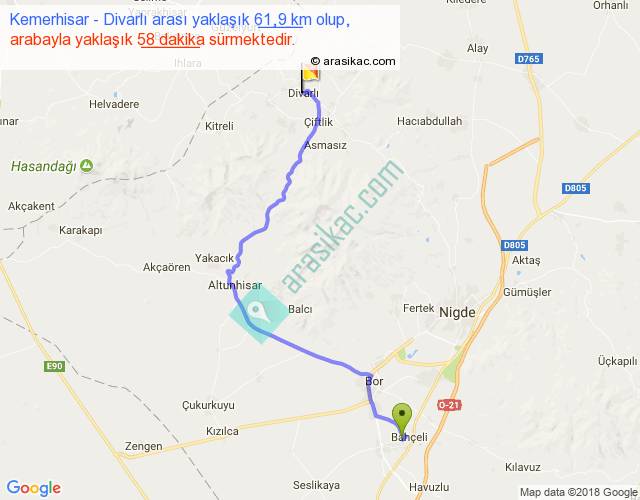 Kemerhisar - Divarlı arası yaklaşık olarak 90 km/h ile yukarıda belirtilen sürede olup, iki yerin kuş uçuşu uzaklığı (mesafesi) 43'dir. Yolculuk otobüsle 1 saat 15 dakika sürmektedir.