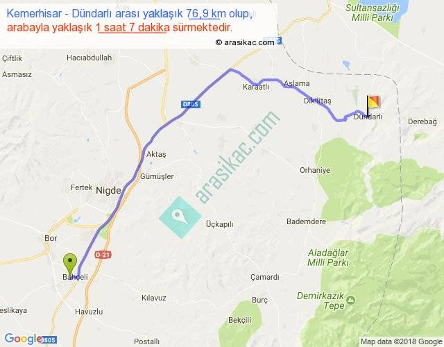 Kemerhisar - Dündarlı arası yaklaşık olarak 90 km/h ile yukarıda belirtilen sürede olup, iki yerin kuş uçuşu uzaklığı (mesafesi) 59'dir. Yolculuk otobüsle 1 saat 27 dakika sürmektedir.