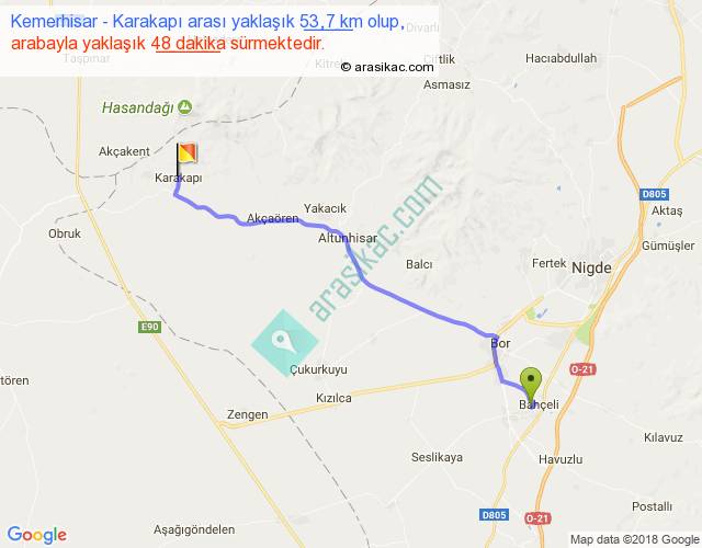 Kemerhisar - Karakapı arası yaklaşık olarak 90 km/h ile yukarıda belirtilen sürede olup, iki yerin kuş uçuşu uzaklığı (mesafesi) 46'dir. Yolculuk otobüsle 1 saat 2 dakika sürmektedir.