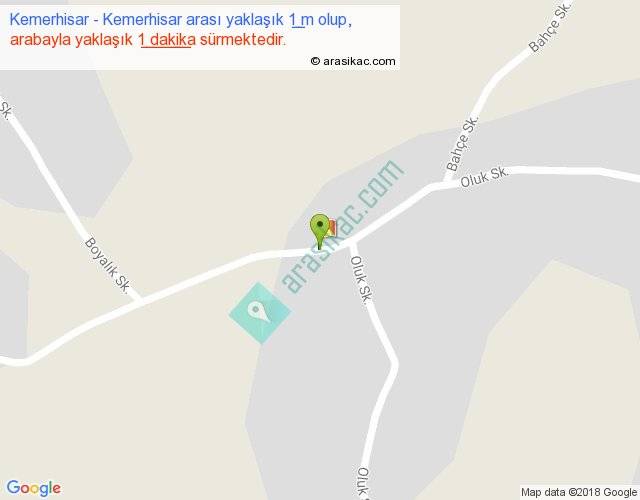 Kemerhisar - Kemerhisar arası yaklaşık olarak 90 km/h ile yukarıda belirtilen sürede olup, iki yerin kuş uçuşu uzaklığı (mesafesi) 0'dir. Yolculuk otobüsle 1 dakika sürmektedir.
