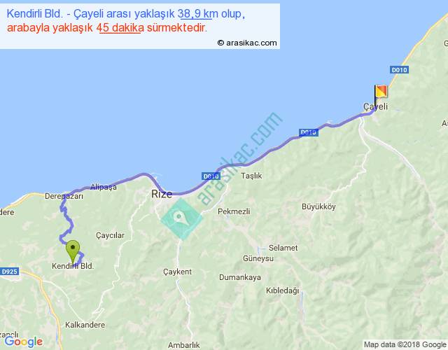 Kendirli Bld. - Çayeli arası yaklaşık olarak 90 km/h ile yukarıda belirtilen sürede olup, iki yerin kuş uçuşu uzaklığı (mesafesi) 28'dir. Yolculuk otobüsle 58 dakika sürmektedir.