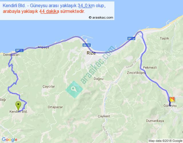Kendirli Bld. - Güneysu arası yaklaşık olarak 90 km/h ile yukarıda belirtilen sürede olup, iki yerin kuş uçuşu uzaklığı (mesafesi) 15'dir. Yolculuk otobüsle 57 dakika sürmektedir.