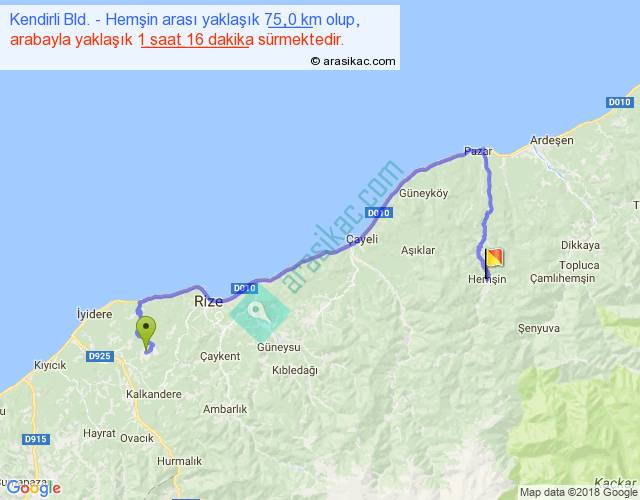 Kendirli Bld. - Hemşin arası yaklaşık olarak 90 km/h ile yukarıda belirtilen sürede olup, iki yerin kuş uçuşu uzaklığı (mesafesi) 40'dir. Yolculuk otobüsle 1 saat 38 dakika sürmektedir.