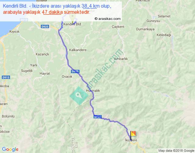 Kendirli Bld. - İkizdere arası yaklaşık olarak 90 km/h ile yukarıda belirtilen sürede olup, iki yerin kuş uçuşu uzaklığı (mesafesi) 24'dir. Yolculuk otobüsle 1 saat 1 dakika sürmektedir.