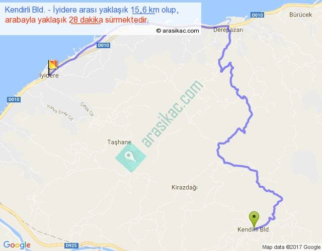 Kendirli Bld. - İyidere arası yaklaşık olarak 90 km/h ile yukarıda belirtilen sürede olup, iki yerin kuş uçuşu uzaklığı (mesafesi) 7'dir. Yolculuk otobüsle 36 dakika sürmektedir.