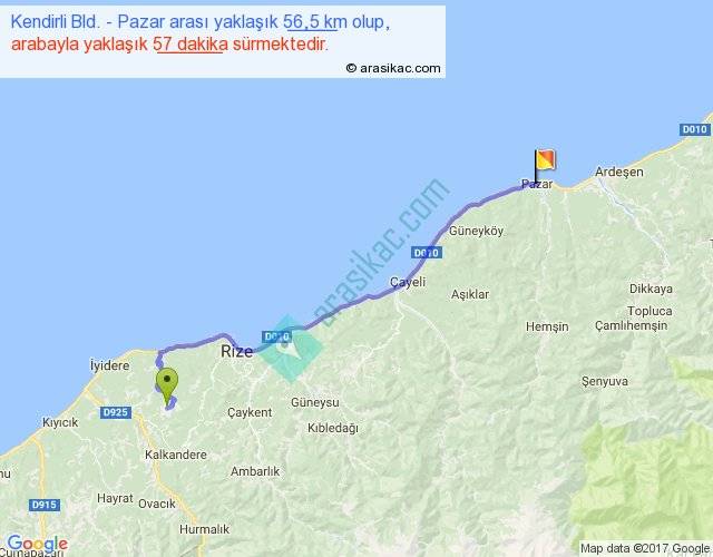 Kendirli Bld. - Pazar arası yaklaşık olarak 90 km/h ile yukarıda belirtilen sürede olup, iki yerin kuş uçuşu uzaklığı (mesafesi) 44'dir. Yolculuk otobüsle 1 saat 14 dakika sürmektedir.