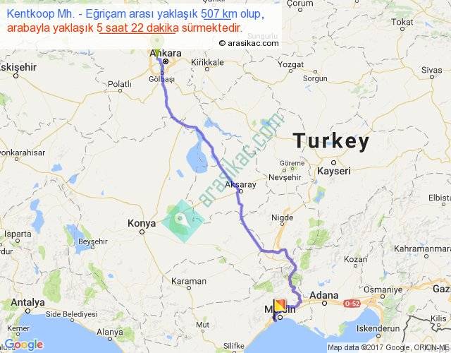 Kentkoop Mh. - Eğriçam arası yaklaşık olarak 90 km/h ile yukarıda belirtilen sürede olup, iki yerin kuş uçuşu uzaklığı (mesafesi) 387'dir. Eğer belirtilen yerler arasında uçak seferi var ise bu süre uçakla 35 dakika'ya kadar düşebilir. Yolculuk otobüsle 6 saat 58 dakika sürmektedir.