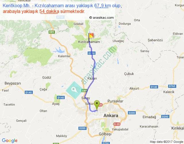Kentkoop Mh. - Kızılcahamam arası yaklaşık olarak 90 km/h ile yukarıda belirtilen sürede olup, iki yerin kuş uçuşu uzaklığı (mesafesi) 56'dir. Yolculuk otobüsle 1 saat 10 dakika sürmektedir.