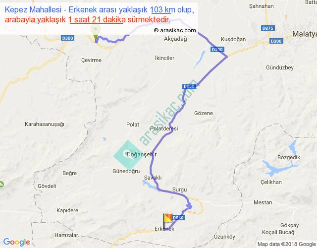 Kepez Mahallesi - Erkenek arası yaklaşık olarak 90 km/h ile yukarıda belirtilen sürede olup, iki yerin kuş uçuşu uzaklığı (mesafesi) 48'dir. Yolculuk otobüsle 1 saat 45 dakika sürmektedir.