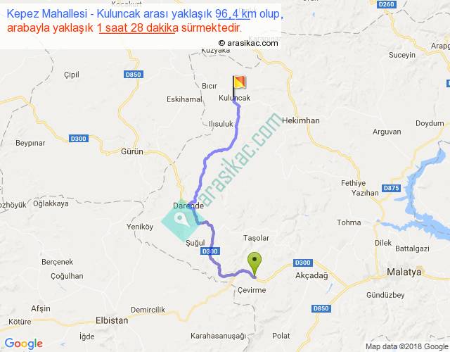 Kepez Mahallesi - Kuluncak arası yaklaşık olarak 90 km/h ile yukarıda belirtilen sürede olup, iki yerin kuş uçuşu uzaklığı (mesafesi) 61'dir. Yolculuk otobüsle 1 saat 54 dakika sürmektedir.