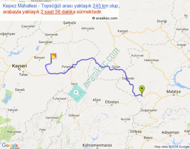 Kepez Mahallesi - Topsöğüt arası yaklaşık olarak 90 km/h ile yukarıda belirtilen sürede olup, iki yerin kuş uçuşu uzaklığı (mesafesi) 155'dir. Yolculuk otobüsle 3 saat 48 dakika sürmektedir.