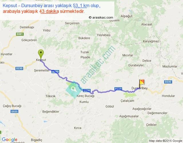 Kepsut - Dursunbey arası yaklaşık olarak 90 km/h ile yukarıda belirtilen sürede olup, iki yerin kuş uçuşu uzaklığı (mesafesi) 42'dir. Yolculuk otobüsle 55 dakika sürmektedir.