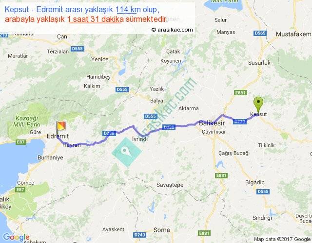 Kepsut - Edremit arası yaklaşık olarak 90 km/h ile yukarıda belirtilen sürede olup, iki yerin kuş uçuşu uzaklığı (mesafesi) 97'dir. Yolculuk otobüsle 1 saat 57 dakika sürmektedir.