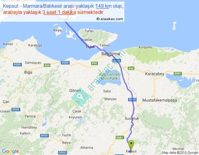 Kepsut - Marmara Balıkesir arası yaklaşık olarak 90 km/h ile yukarıda belirtilen sürede olup, iki yerin kuş uçuşu uzaklığı (mesafesi) 113'dir. Yolculuk otobüsle 3 saat 55 dakika sürmektedir.