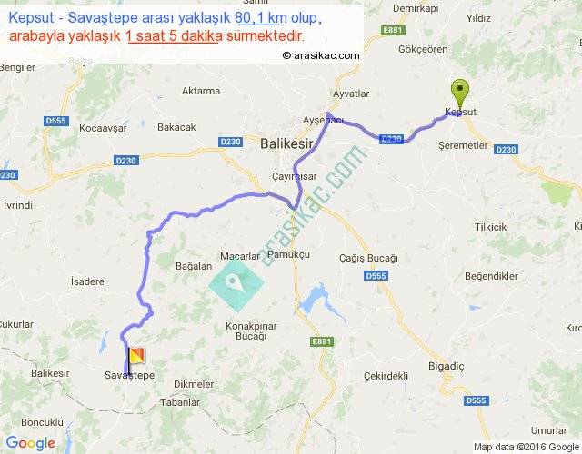 Kepsut - Savaştepe arası yaklaşık olarak 90 km/h ile yukarıda belirtilen sürede olup, iki yerin kuş uçuşu uzaklığı (mesafesi) 54'dir. Yolculuk otobüsle 1 saat 24 dakika sürmektedir.