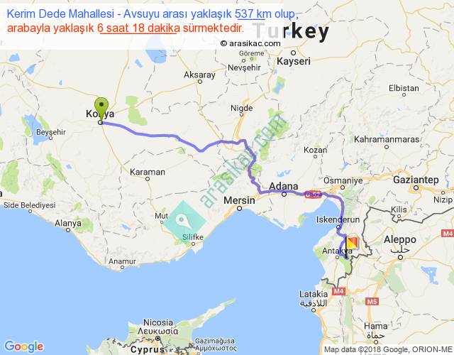 Kerim Dede Mahallesi - Avsuyu arası yaklaşık olarak 90 km/h ile yukarıda belirtilen sürede olup, iki yerin kuş uçuşu uzaklığı (mesafesi) 383'dir. Eğer belirtilen yerler arasında uçak seferi var ise bu süre uçakla 35 dakika'ya kadar düşebilir. Yolculuk otobüsle 8 saat 11 dakika sürmektedir.