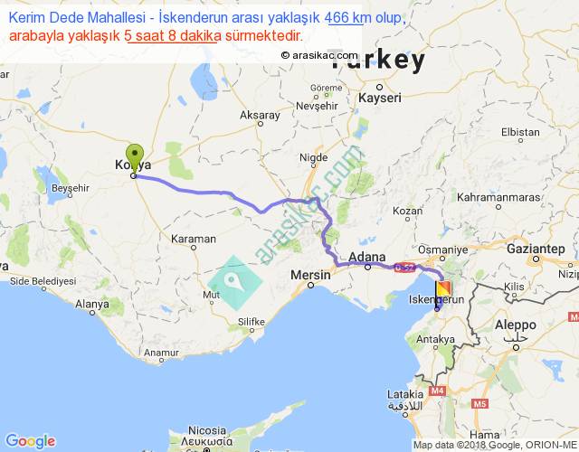 Kerim Dede Mahallesi - İskenderun arası yaklaşık olarak 90 km/h ile yukarıda belirtilen sürede olup, iki yerin kuş uçuşu uzaklığı (mesafesi) 352'dir. Eğer belirtilen yerler arasında uçak seferi var ise bu süre uçakla 32 dakika'ya kadar düşebilir. Yolculuk otobüsle 6 saat 40 dakika sürmektedir.