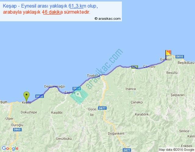 Keşap - Eynesil arası yaklaşık olarak 90 km/h ile yukarıda belirtilen sürede olup, iki yerin kuş uçuşu uzaklığı (mesafesi) 55'dir. Yolculuk otobüsle 59 dakika sürmektedir.