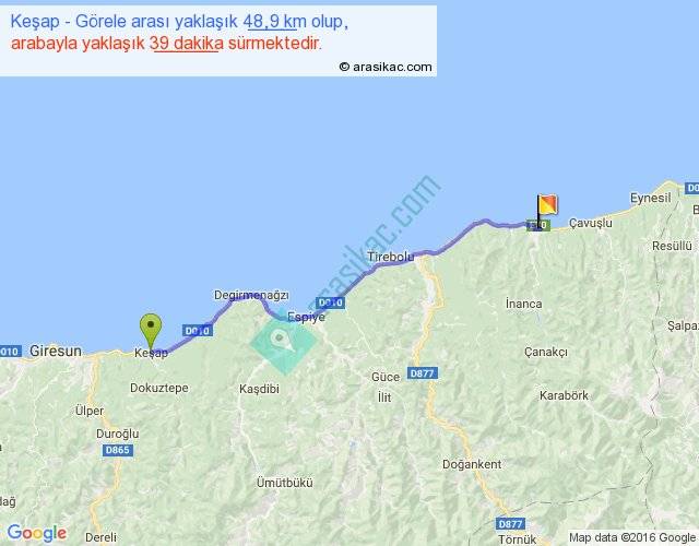Keşap - Görele arası yaklaşık olarak 90 km/h ile yukarıda belirtilen sürede olup, iki yerin kuş uçuşu uzaklığı (mesafesi) 43'dir. Yolculuk otobüsle 50 dakika sürmektedir.