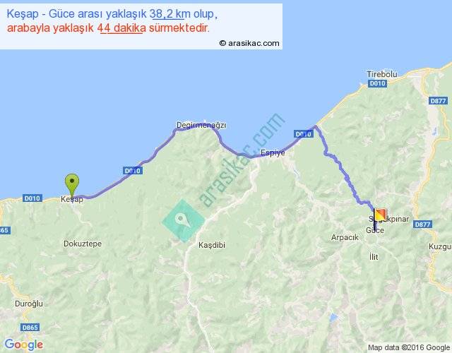 Keşap - Güce arası yaklaşık olarak 90 km/h ile yukarıda belirtilen sürede olup, iki yerin kuş uçuşu uzaklığı (mesafesi) 25'dir. Yolculuk otobüsle 57 dakika sürmektedir.