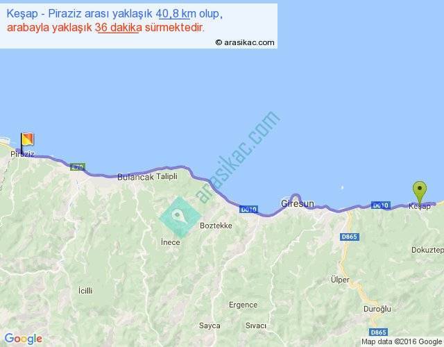Keşap - Piraziz arası yaklaşık olarak 90 km/h ile yukarıda belirtilen sürede olup, iki yerin kuş uçuşu uzaklığı (mesafesi) 33'dir. Yolculuk otobüsle 46 dakika sürmektedir.