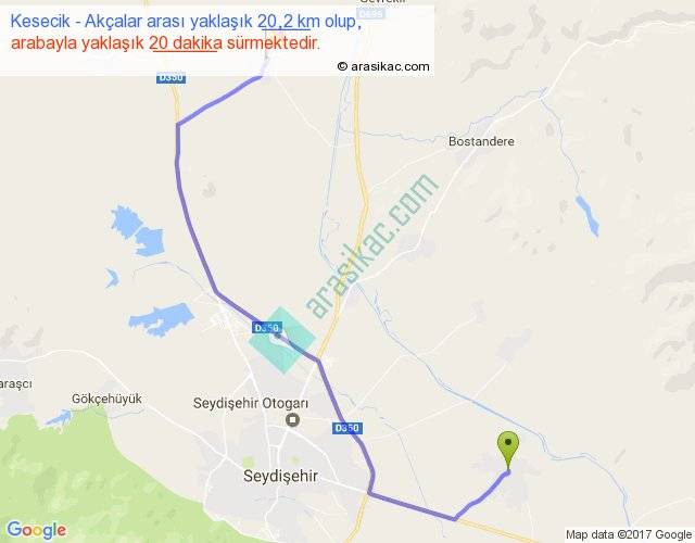 Kesecik - Akçalar arası yaklaşık olarak 90 km/h ile yukarıda belirtilen sürede olup, iki yerin kuş uçuşu uzaklığı (mesafesi) 13'dir. Yolculuk otobüsle 26 dakika sürmektedir.