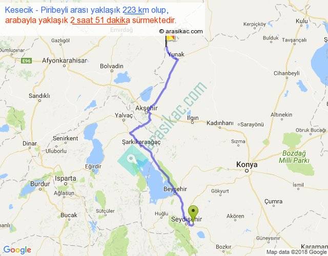 Kesecik - Piribeyli arası yaklaşık olarak 90 km/h ile yukarıda belirtilen sürede olup, iki yerin kuş uçuşu uzaklığı (mesafesi) 167'dir. Yolculuk otobüsle 3 saat 42 dakika sürmektedir.