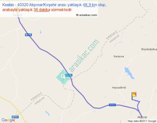Keskin - 40320 Akpınar Kırşehir arası yaklaşık olarak 90 km/h ile yukarıda belirtilen sürede olup, iki yerin kuş uçuşu uzaklığı (mesafesi) 34'dir. Yolculuk otobüsle 46 dakika sürmektedir.