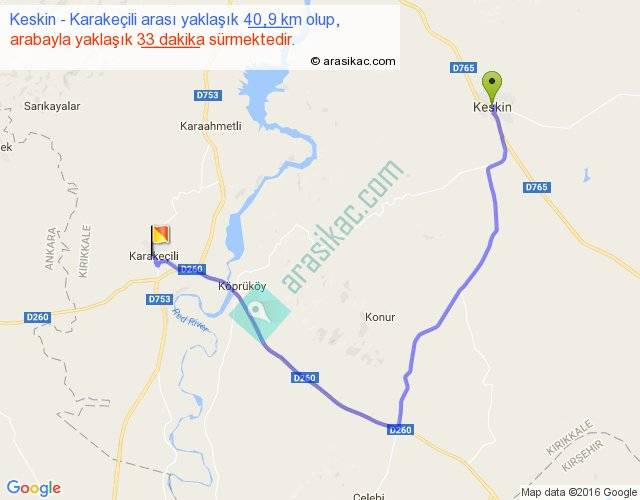Keskin - Karakeçili arası yaklaşık olarak 90 km/h ile yukarıda belirtilen sürede olup, iki yerin kuş uçuşu uzaklığı (mesafesi) 22'dir. Yolculuk otobüsle 42 dakika sürmektedir.