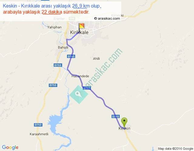 Keskin - Kırıkkale arası yaklaşık olarak 90 km/h ile yukarıda belirtilen sürede olup, iki yerin kuş uçuşu uzaklığı (mesafesi) 20'dir. Yolculuk otobüsle 28 dakika sürmektedir.